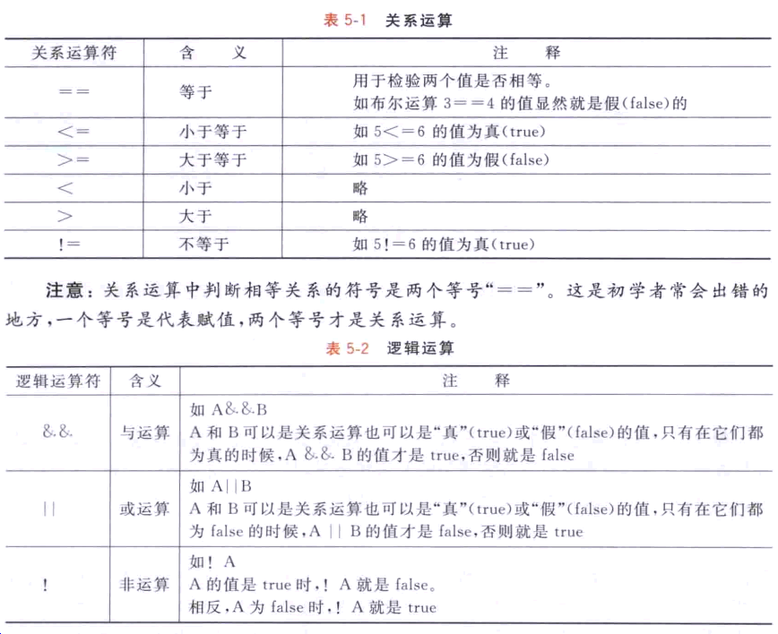我們先來看看什么是條件表達(dá)式。簡單地說,條件表達(dá)式是一個結(jié)果值只可能為 “真”(true) 或“假”(false) 的計算式。它們可以分為兩種: 一種叫關(guān)系運算;另一種叫邏輯 運算。關(guān)系運算主要用來判斷值的大小關(guān)系,比如判斷a 和 b 是否相等,或是判斷c 和 d 誰大誰小。而使用邏輯運算可以把幾個關(guān)系運算連接起來,表達(dá)更復(fù)雜的邏輯,比如,“a 大于b, 而 且c 大 于d” 這個式子是真還是假?我們把Z常用的這類運算總結(jié)在表5-1和 表5-2中。