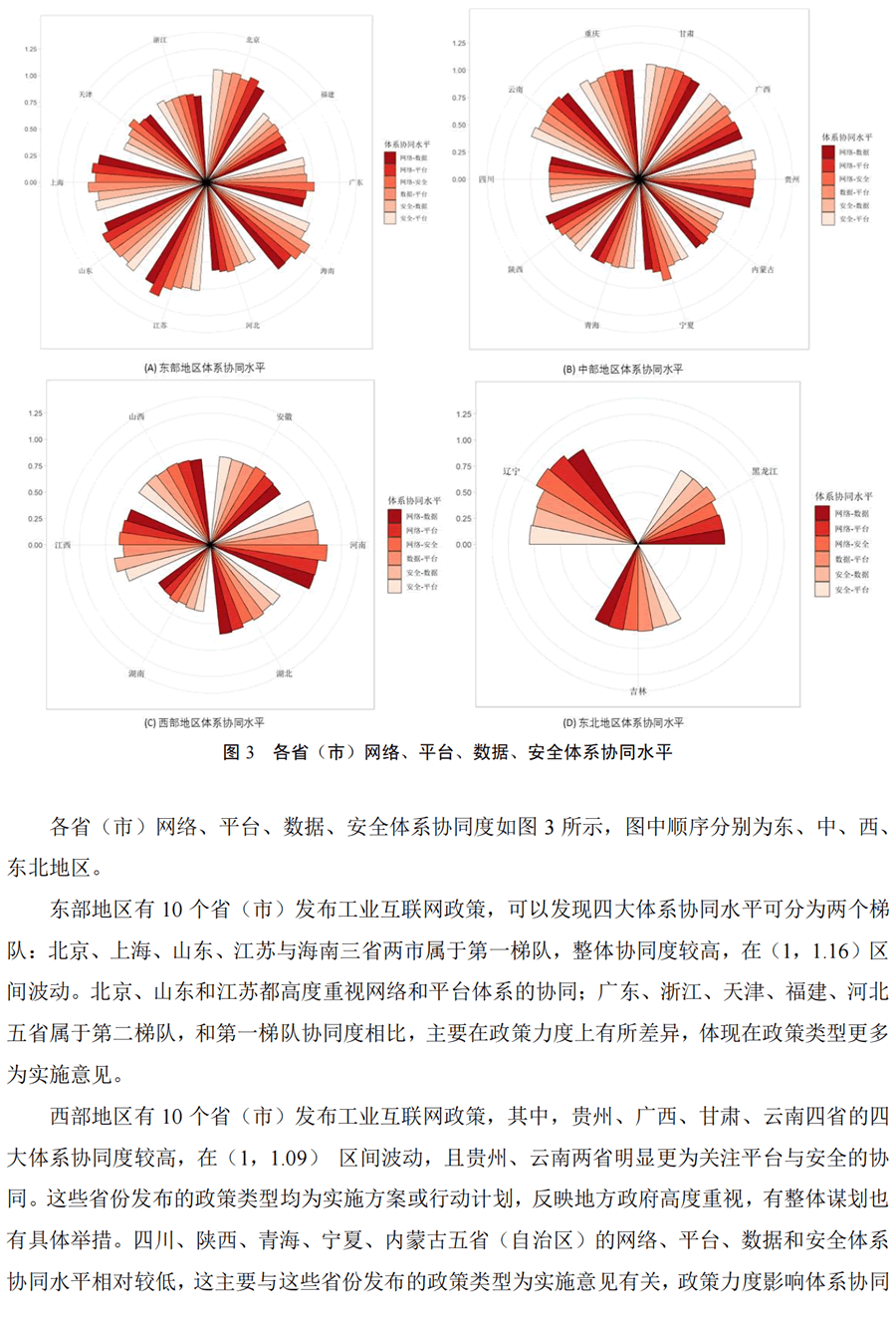 現(xiàn)有研究多圍繞工業(yè)互聯(lián)網(wǎng)架構(gòu)、標準和平臺體系展開,較少分析地方政府對四大功能體系 建設(shè)的政策導(dǎo)向。本文一方面應(yīng)用協(xié)同度算法評價地方政策體系協(xié)同水平,識別體系協(xié)同短板, 另一方面總結(jié)東、中、西和東北地區(qū)地方政策建設(shè)工業(yè)互聯(lián)網(wǎng)的側(cè)重點差異。