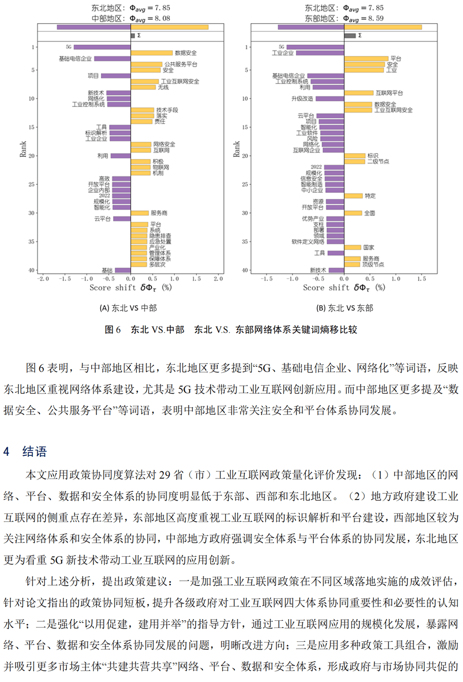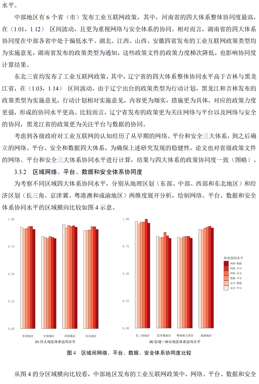 摘 要:我國工業(yè)互聯(lián)網(wǎng)發(fā)展具有典型的“政策指引,建用互促”特征。本文基于政策文本計算思路,構(gòu)建政 策協(xié)同度算法,定量評價 29 省(市)工業(yè)互聯(lián)網(wǎng)政策導(dǎo)向的網(wǎng)絡(luò)、平臺、數(shù)據(jù)、安全四大體系協(xié)同水平。研究 發(fā)現(xiàn)東部和西部地區(qū)的四大體系協(xié)同度G,中部地區(qū)相對偏低。各地推進四大體系協(xié)同建設(shè)的短板各異,反映 地方政府認知并發(fā)展工業(yè)互聯(lián)網(wǎng)的焦點存在差異。