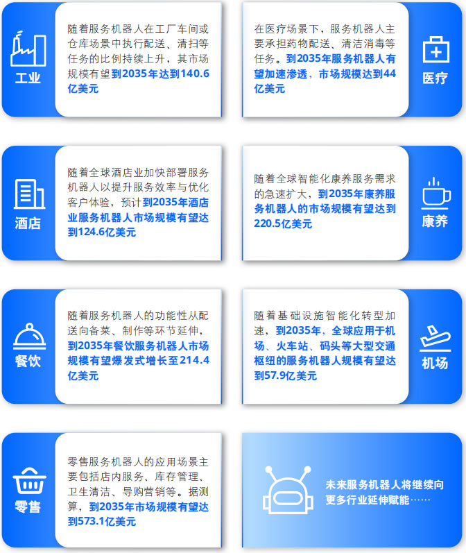 隨著基礎(chǔ)設(shè)施智能化轉(zhuǎn)型加 速,到2035年,應(yīng)用于機 場、火車站、碼頭等大型交通 樞紐的服務(wù)機器人規(guī)模有望達 到57.9億美元