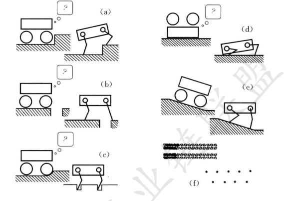 腿式運(yùn)動(dòng)以一系列機(jī)器人和地面之間的點(diǎn)接觸為特征。其主要優(yōu)點(diǎn)包括在粗糙地形上(圖2.5)的自適應(yīng)性和機(jī)動(dòng)性。因?yàn)橹恍枰唤M點(diǎn)接觸,所以只要機(jī)器人能夠 保持適當(dāng)?shù)牡孛嬲麧嵍,這些點(diǎn)之間的地面質(zhì)量是無(wú)關(guān)緊要的。另外,只要行走機(jī)器 人的步距大于洞穴的寬度,它就能跨越洞穴或者裂口。腿式運(yùn)動(dòng)的Z后一個(gè)優(yōu)點(diǎn)是, 能用高度的技巧來(lái)操縱環(huán)境中的物體。舉一個(gè)精彩的昆蟲例子,即甲殼蟲,它用靈巧 的前肢在運(yùn)動(dòng)的同時(shí)能夠滾動(dòng)一個(gè)球。