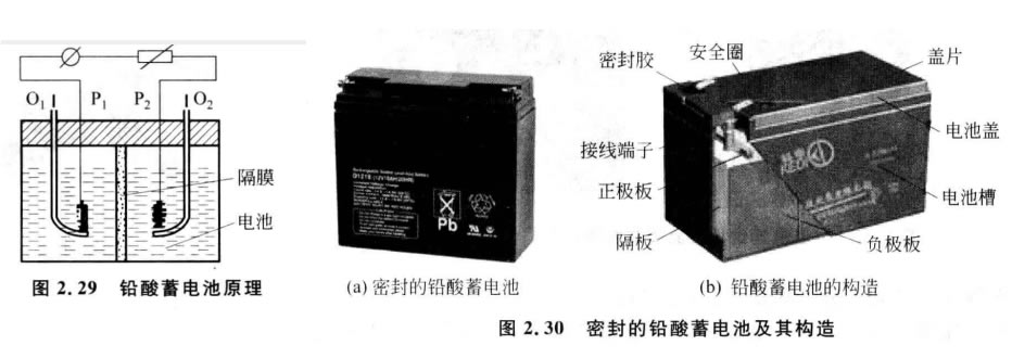 1859年,法國人普蘭特發(fā)明了鉛酸蓄電池,至今已有 150多年的發(fā)展歷程。鉛酸蓄電池在理論研究、產(chǎn)品種類 及品種、產(chǎn)品電氣性能等方面都得到了長足的進步,在交 通、通信、電力、軍事、航海、航空等各個領(lǐng)域,鉛酸蓄電池都 起到了不可缺少的重要作用。鉛酸蓄電池的原理和構(gòu)造如 圖2.29和圖2.30所示,它是一種電極由鉛及其氧化物制成,電解液是硫酸溶液的蓄電池。鉛酸蓄電池在荷電狀態(tài)下,正極的主要成分是二氧化 鉛,負(fù)極主要成分為鉛。在放電狀態(tài)下,正負(fù)極的主要成分均為硫酸鉛。