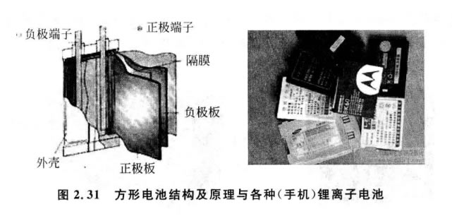鋰電池是指電化學(xué)體系中含有鋰(包括金屬鋰、鋰合金、鋰離子、鋰聚合物),由鋰金 屬或鋰合金為負(fù)極材料、使用非水電解質(zhì)溶液的電池。鋰電池大致分為鋰金屬電池和鋰 離子電池兩類。鋰金屬電池內(nèi)含金屬態(tài)鋰,它通常是不可充電的。鋰離子電池不含有金 屬態(tài)鋰,它可以充電。Z早出現(xiàn)的鋰電池來自于偉大的發(fā)明家愛迪生,他使用了反應(yīng) Li+MnO₂=LiMnO₂ 。 該反應(yīng)為氧化還原反應(yīng)和放電。由于鋰金屬的化學(xué)特性非; 潑,使得鋰金屬的加工和保存及使用對環(huán)境要求非常高,所以鋰電池長期沒有得到廣泛 應(yīng)用。但是,鋰電池現(xiàn)在已經(jīng)成為了主流,如圖2.31所示。鋰離子電池中因為不含有重 金屬鎘,與鎳鎘電池相比較,它可以大大減少對環(huán)境的污染。