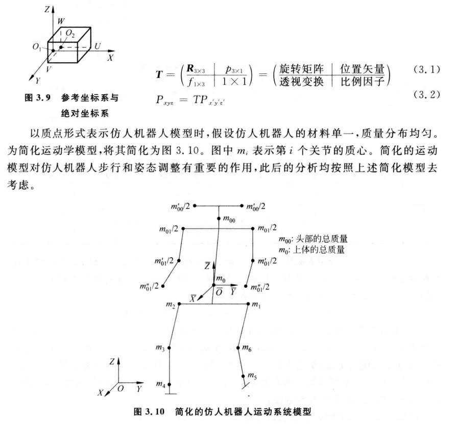 智能接待仿人機(jī)器人除了具有腿部的行走功能外,還具有上身的功能,自由度也比雙足機(jī)器 人成倍的增加。從仿生角度看,人的手臂在運(yùn)動中起著協(xié)調(diào)運(yùn)動的作用,智能接待仿人機(jī)器人的手 臂是d立運(yùn)動的,在行走運(yùn)動過程中起著重要的調(diào)整作用。從運(yùn)動鏈角度看,智能接待仿人機(jī)器人由于有手臂運(yùn)動,故它是由三條鏈組成的復(fù)合運(yùn)動鏈,運(yùn)動學(xué)、動力學(xué)、運(yùn)動規(guī)劃上更為復(fù) 雜,不能直接用雙足機(jī)器人的動力學(xué)模型來描述[94]。本節(jié)將在雙足機(jī)器人模型的基礎(chǔ)上, 結(jié)合智能接待仿人機(jī)器人的運(yùn)動特點(diǎn),建立一個合適的運(yùn)動模型,導(dǎo)出步行運(yùn)動的數(shù)學(xué)描述。 本節(jié)設(shè)計(jì)的是一個19 DOF 的智能接待仿人機(jī)器人,暫不考慮其頭部 和手指的自由度。