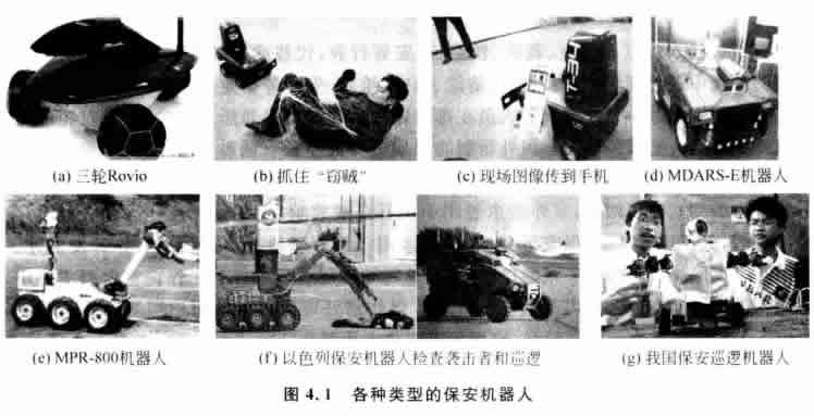 美國的一家公司正在研制一種多用途保安機器人MPR-800, 它可用于掃雷、滅火、核 生化污染清除等多項危險工作,如圖4.1(e) 所示。以色列的保安機器人也非常先進,除 了可以檢查恐怖襲擊者外,還可以保障飛機跑道的安全,如圖4.1(f)所示。俄羅斯研制 的D一個保安機器人已于2007年6月開始正式在彼爾姆市街頭巡邏,該保安機器人質(zhì) 量為250kg, 身高180cm, 配備有5臺照相機和供路人使用的求助按鈕。并且它還會發(fā)出 一些簡單的指令,例如勸誡人們不要在街上酗酒滋事等。此外,我國東莞理工學院的大 學生也設(shè)計了一個保安巡邏機器人,如圖4.1(g) 所示。它以太陽能為主,電動小車為載 體,采用多種高性能傳感器自動地檢測障礙物和完成自動值守、報警等各種保安任務(wù)。 它能在校園和小區(qū)及其他環(huán)境下完成巡邏監(jiān)控,或者與固定監(jiān)控設(shè)備組成一個嚴密的監(jiān) 控網(wǎng)絡(luò)。