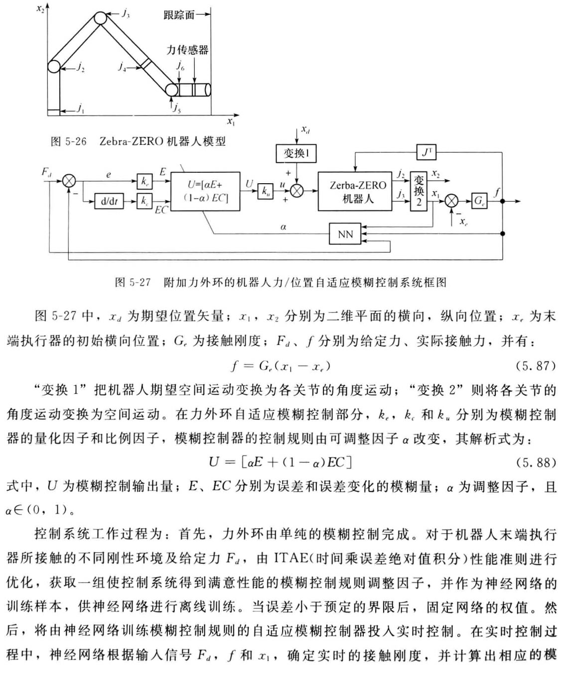 所提出的附加力外環(huán)的機(jī)器人力/位置自適應(yīng)模糊控制方法,應(yīng)用在一臺(tái)帶力傳感器 的Zebra-ZERO(斑馬)6關(guān)節(jié)機(jī)器人上,其模型如圖5-26所示。機(jī)器人的位置控制器為常 規(guī)PID 控制,且人-機(jī)接口界面只提供簡(jiǎn)單的操作指 令,如初始化指令、狀態(tài)輸出指令、關(guān)節(jié)角移動(dòng)指 令等。在實(shí)現(xiàn)跟蹤控制時(shí),固定j₁,j₄ 和 j₆ 三個(gè)關(guān) 節(jié),由j2 和j₃ 關(guān)節(jié)在x₂ 方向?qū)崿F(xiàn)跟蹤,并對(duì)x₁ 方 向的接觸力進(jìn)行控制,關(guān)節(jié)js 使機(jī)器人末端執(zhí)行器 與跟蹤面垂直。整個(gè)控制系統(tǒng)由一臺(tái)PC486 主機(jī)(帶 機(jī)器人控制器)、電源、控制接口板及機(jī)器人主體組 成,其系統(tǒng)原理框圖如圖5-27所示。